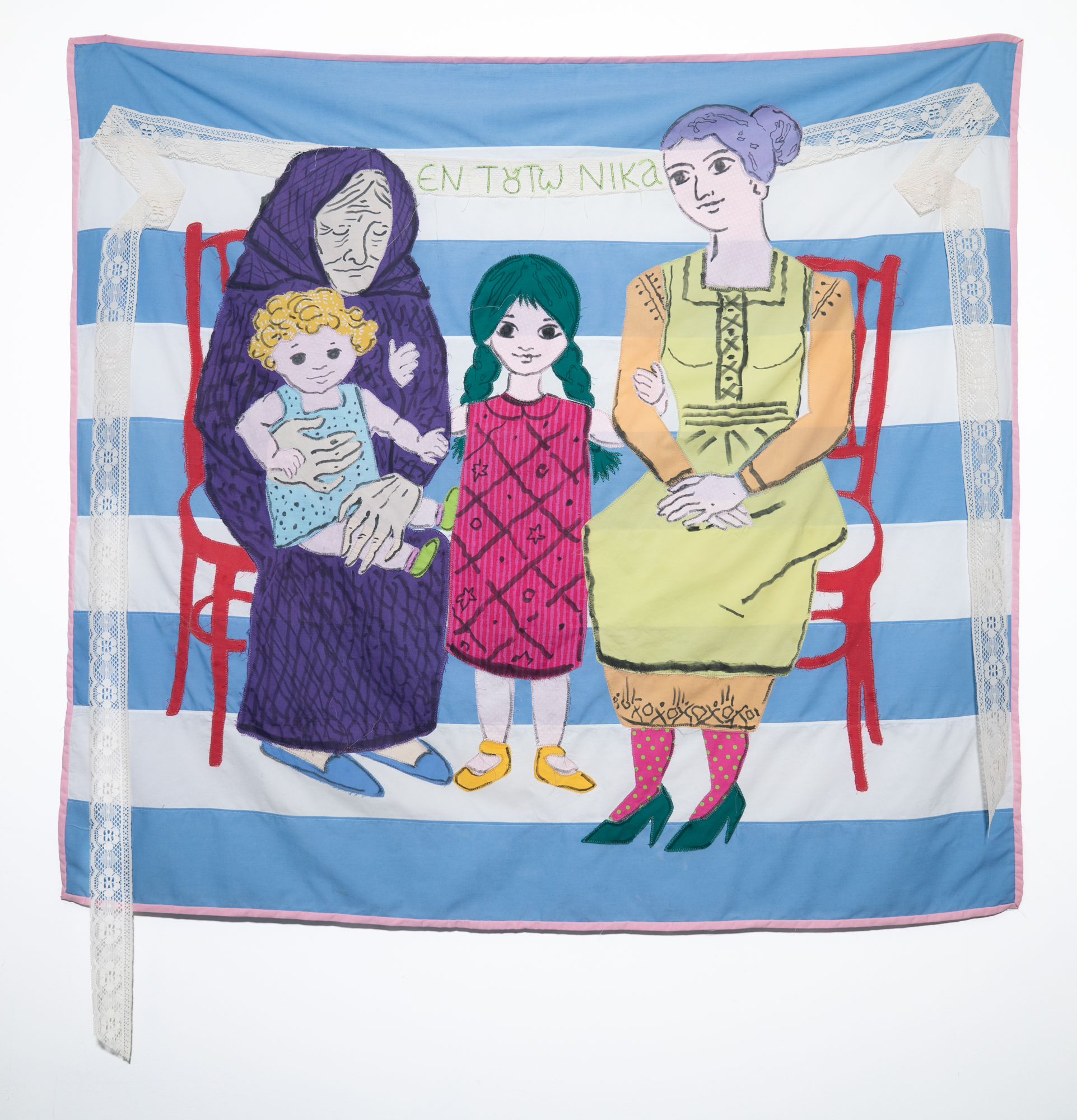 The exhibition “Εν Τούτω Νίκα” (In This Sign Conquer) invites us on a journey through time into the struggles and pain of women – guided by Anna, a figure from the first-grade Greek school book Alphavitario (1955).* Anna’s journey begins in antiquity and reaches the present day.
