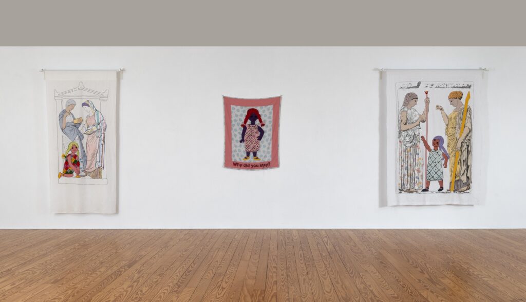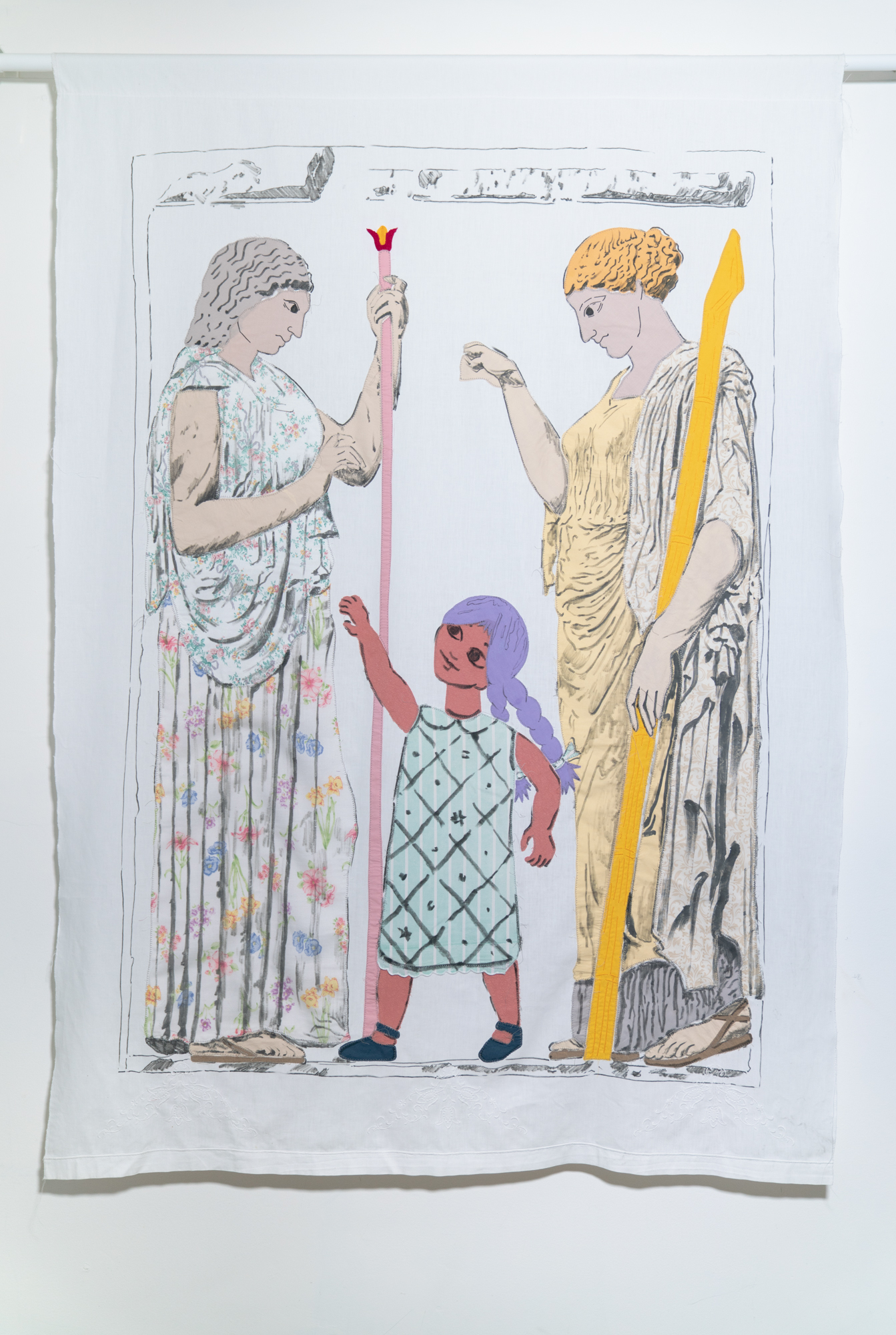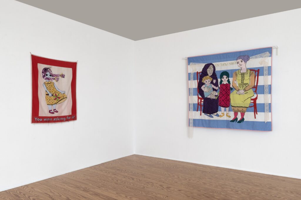 The works in the exhibition are created from bed sheets donated by women and feminine identifying individuals living in Greece, on the condition that they had rested upon them and dreamed of a just and safe world.