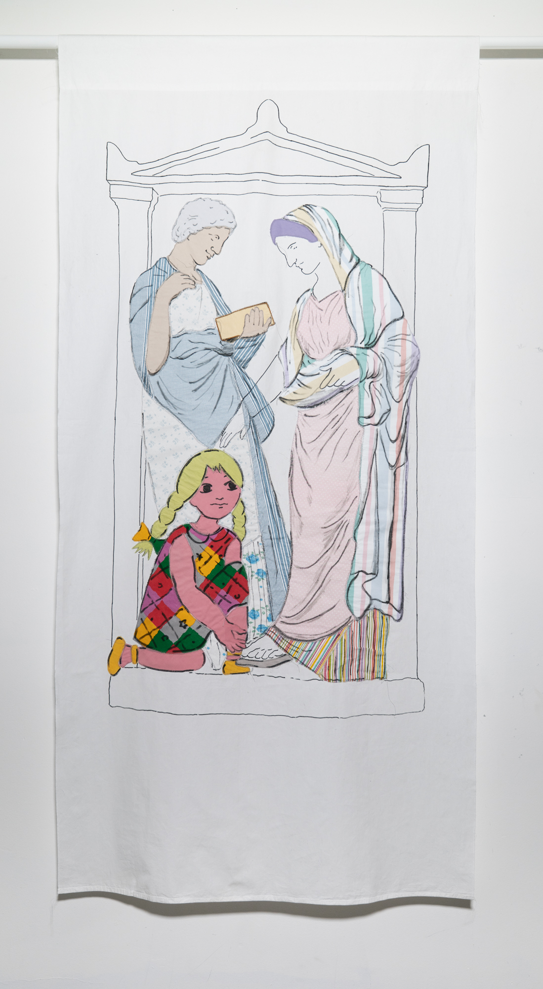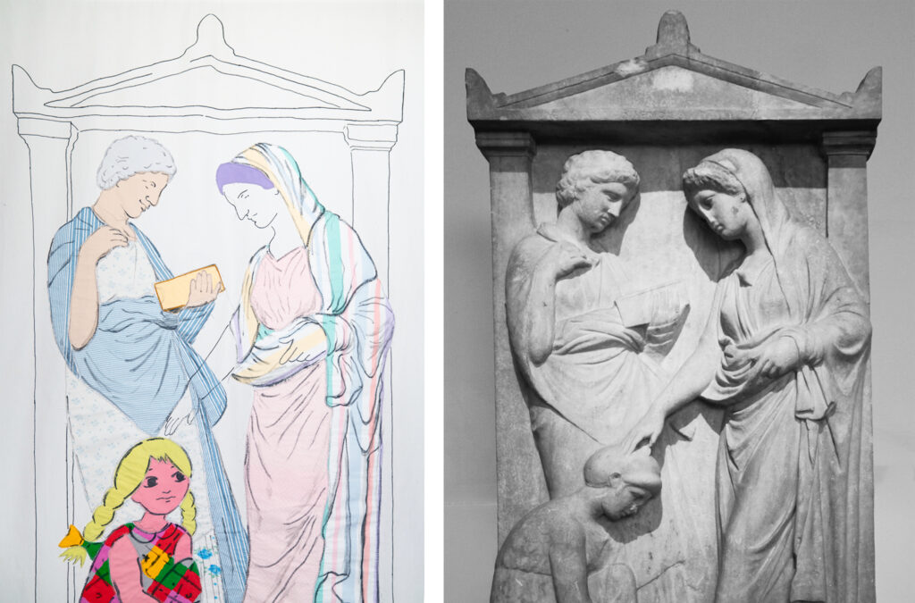 Using the visual language of ancient Greek grave steles, Lale traces Anna’s path from the Great Relief of the Eleusinian Mysteries (440–430 BC), where her pilgrimage is blessed by Demeter, the goddess of harvest and a victim of rape, and her daughter Persephone, the goddess of the Underworld and a victim of femicide. The journey with Anna continues through two funerary steles from the 5th and 4th centuries BC. On the “Stele of Ameinokleia”, Anna helps her mother prepare for her passage to the Underworld. In the work “Pieta”, we see Anna dead in her mother’s arms – a tribute to all mothers who lose their children, whether to the armed hand of a partner, to state negligence, or to the cruelty of war.