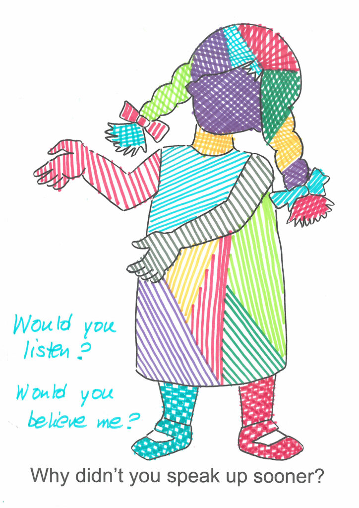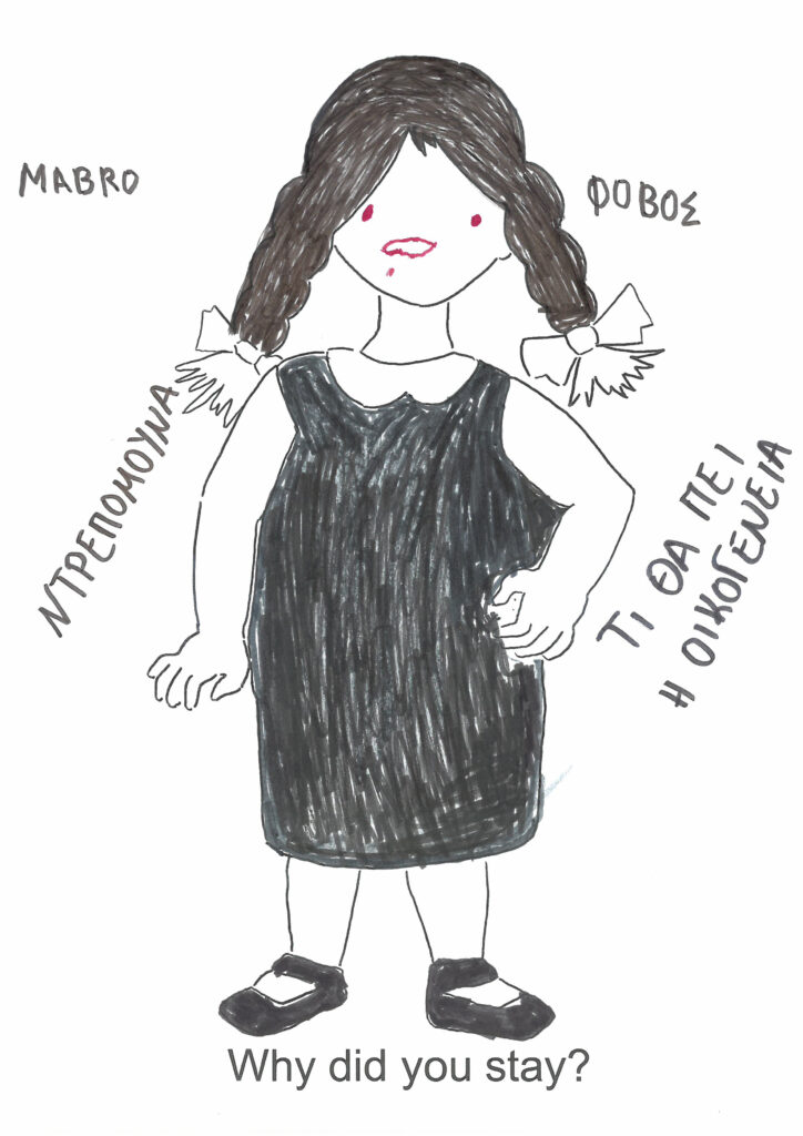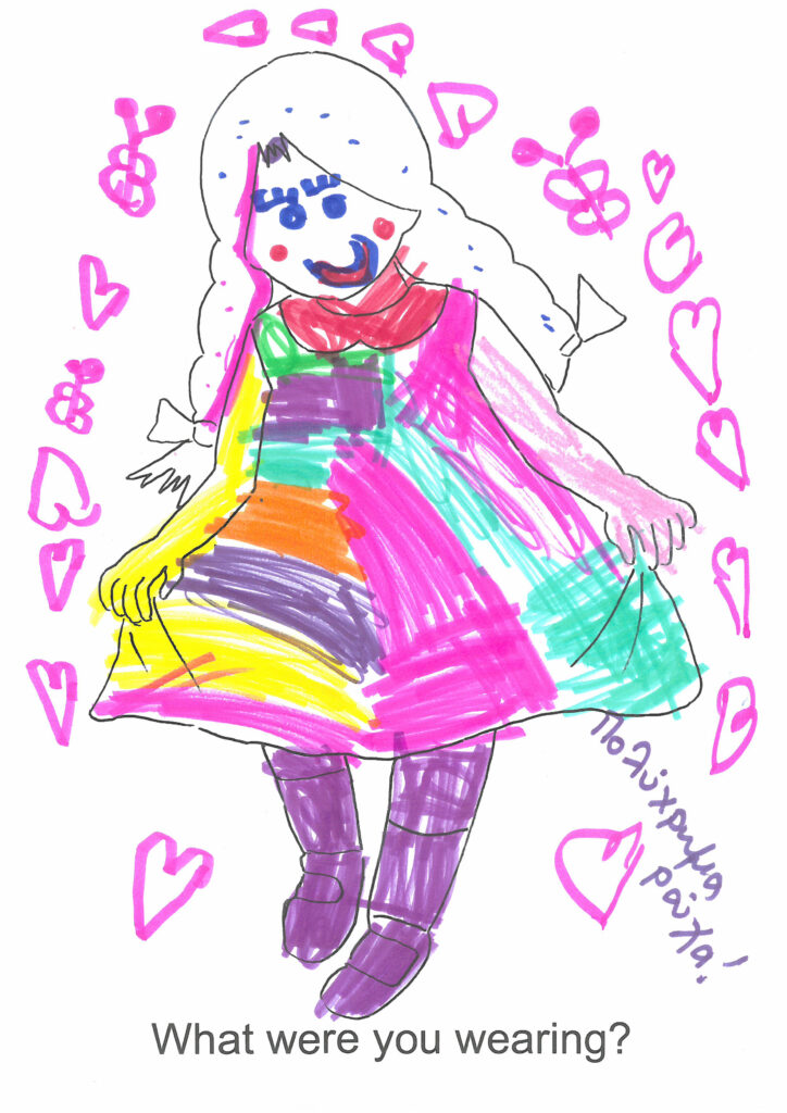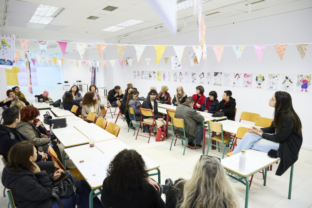 More than 100 drawings were created in preparation for the festival by women and femmes during workshops led by Georgia Lale, in collaboration with organizations that support people who have experienced gender-based violence and/or face mental health challenges. The resulting artworks were part of the “True Blue” festival’s “Classroom”. The organizations that participated in the workshops were the Center for Gender Equality DIOTIMA, Action for Women, Red Umbrella Athens, ANASA, and GRIBS International.