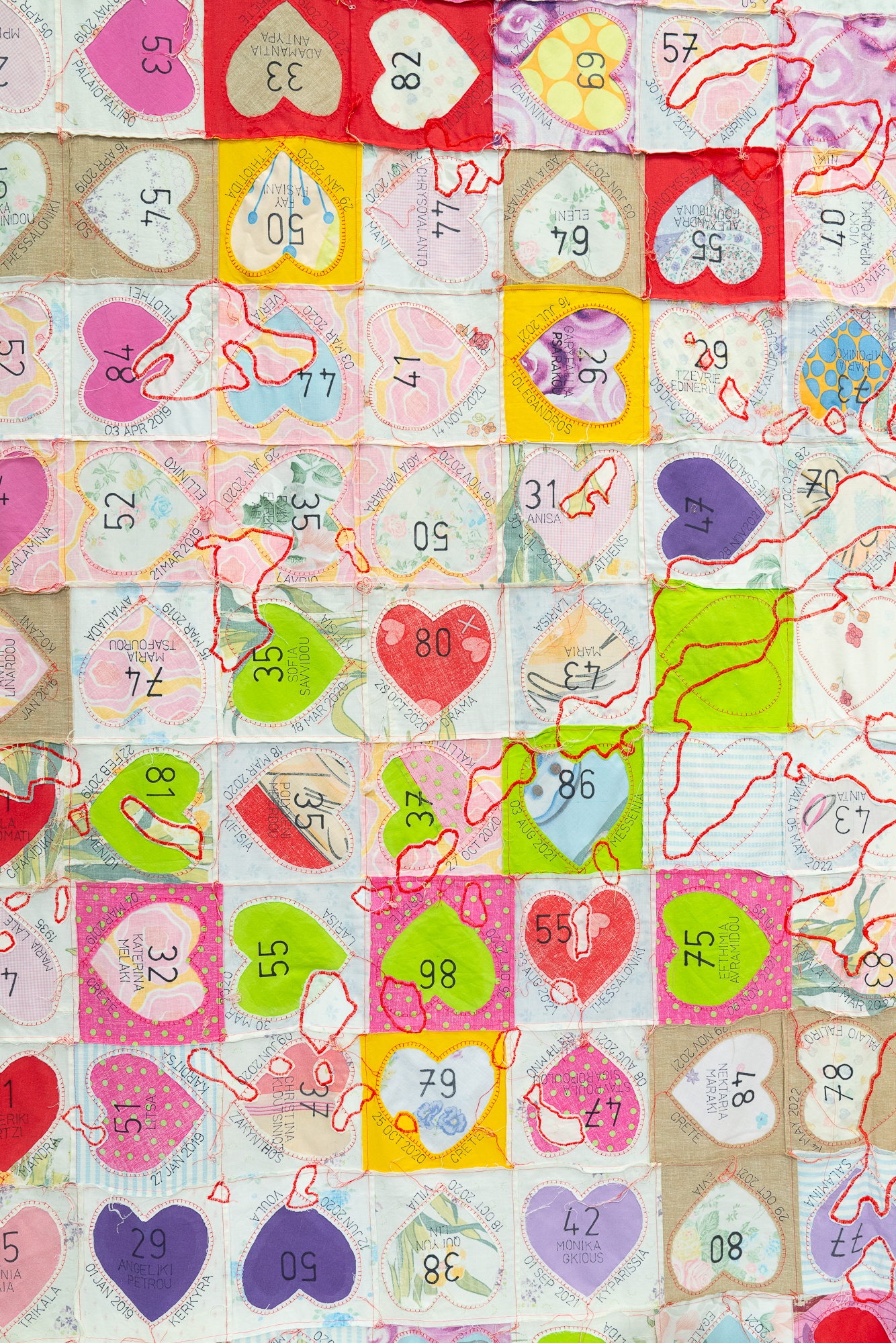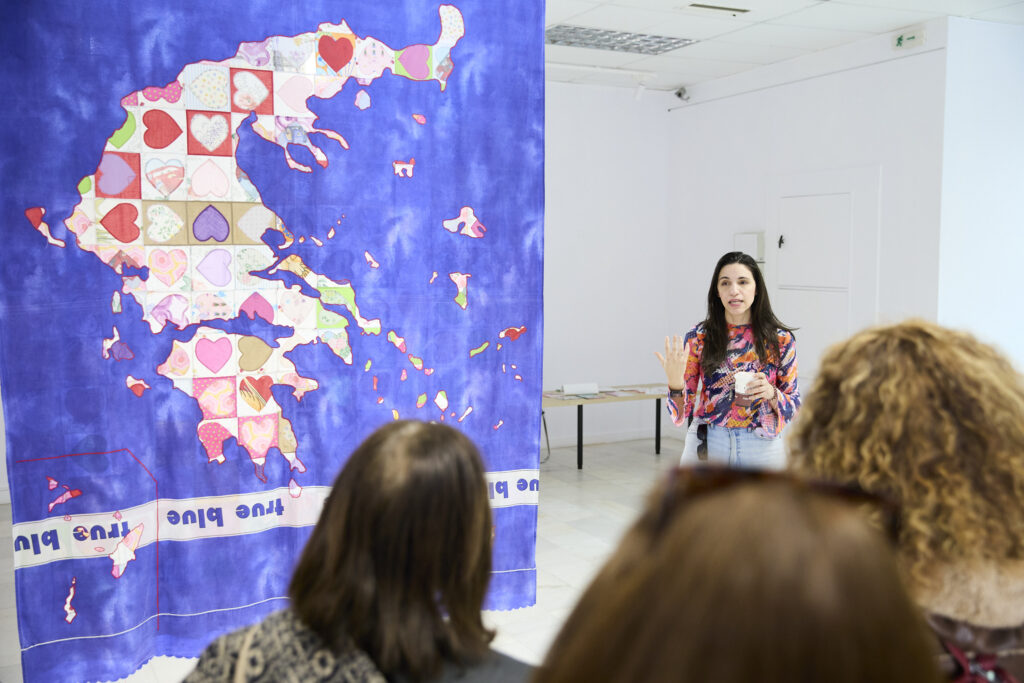 The artwork “True Blue” features the map of Greece made from bedsheets donated by women to the artist, on the condition that they had rested on them and dreamed of an equal and safe world. This piece commemorates victims of femicide in Greece from 2008 to 2025.